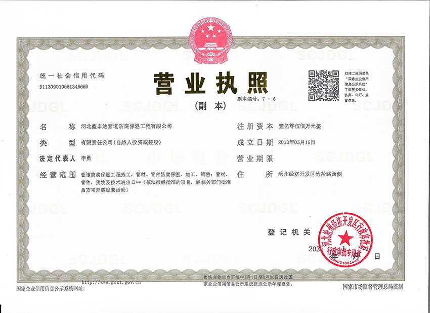 河北鑫豐達管道防腐保溫工程有限公司坐落于滄州市開發區,通過ISO9000質量管理體系認證。本廠擁有工程師4名、技術人員30名,員工60人,注冊資金5500萬元。專門從事3pe/2pe防腐鋼管、保溫防腐鋼管、防腐螺旋鋼管、水泥砂漿防腐鋼管、等配套工程施工,以及防腐材料研發制造的大型專業化企業。是河北省防腐保溫行業協會理事單位。年生產能力500萬平方米。
